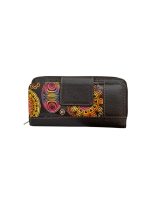 Billetera larga elaborada en cuero, diseño repujado. Contiene múltiples compartimientos para tarjeta, espacio con cremallera para monedas, cuatro compartimientos para billetes. En el espacio principal tiene compartimientos incluso para guardar un celular.