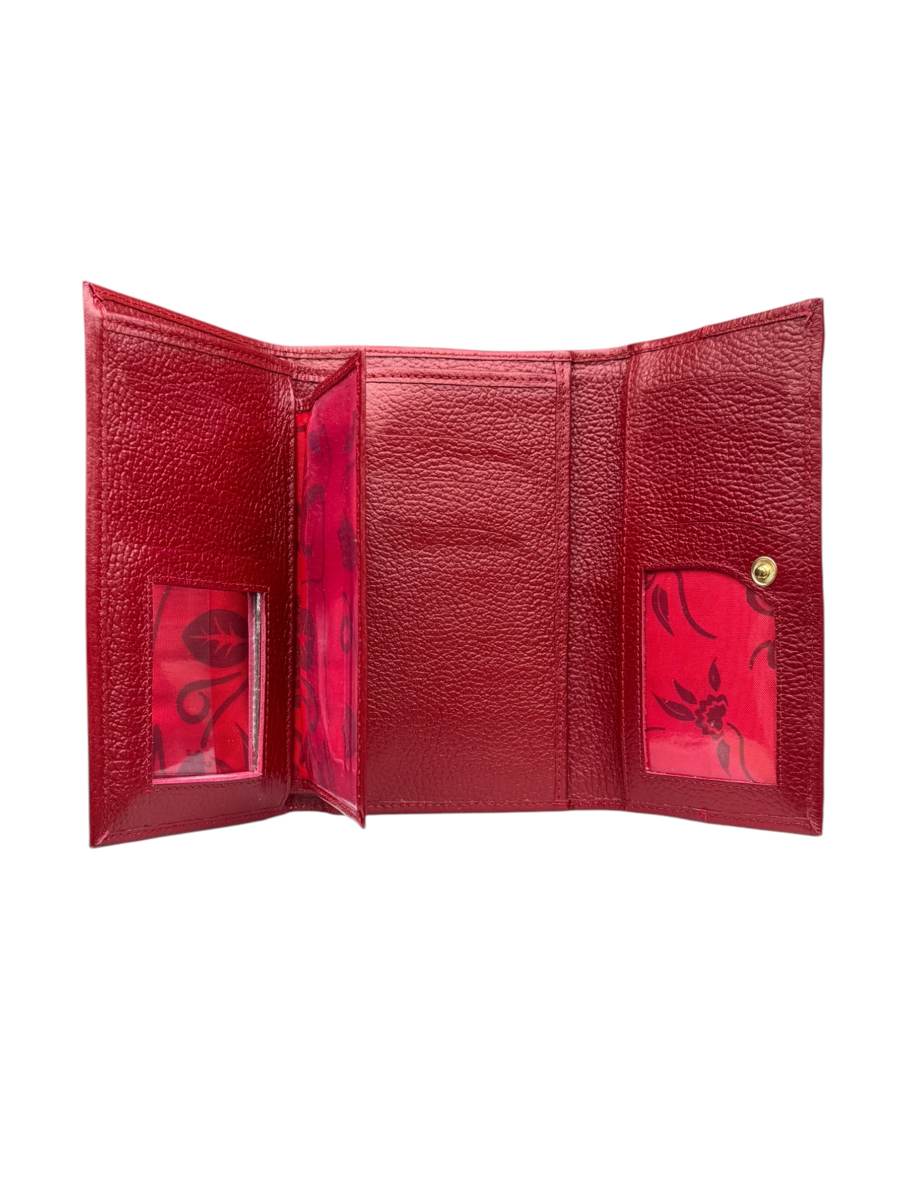 Billetera elaborada en cuero, cuenta con múltiples compartimientos y monedero en su parte posterior. Medidas aproximadas 16,5 cm de ancho y 10 cm de alto.