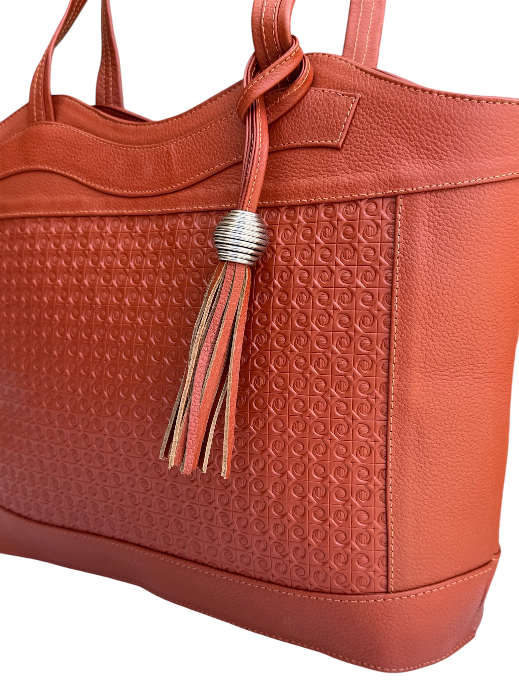 Bolso elaborado en cuero, dos compartimiento internos uno de ellos con cremallera, grabado y accesorio que dan un toque de exclusividad y elegancia.