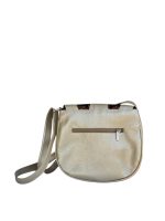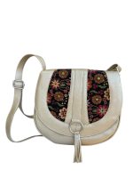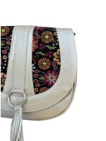 Bolso manos libres en cuero, con detalle faja tejido flores. Adicional al compartimiento principal, cuenta con tres bolsillos ubicados uno bajo la tapa tejida, otro en la parte posterior del bolso y otro en su parte interna, todos ellos con cremallera.