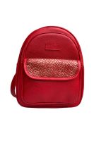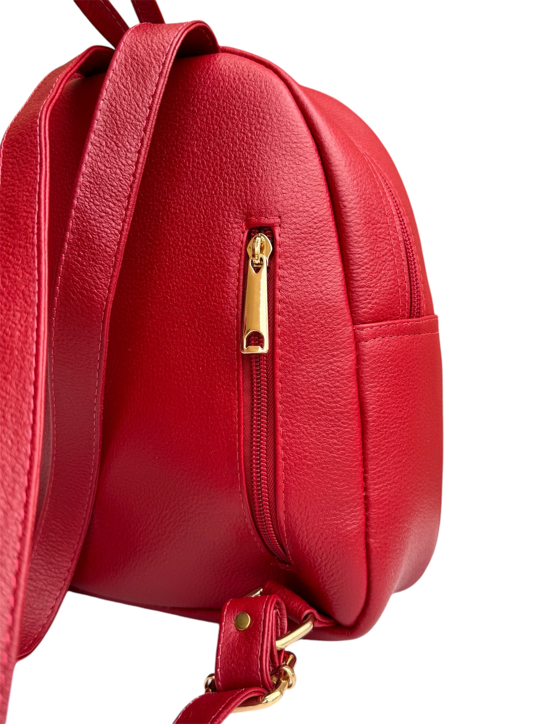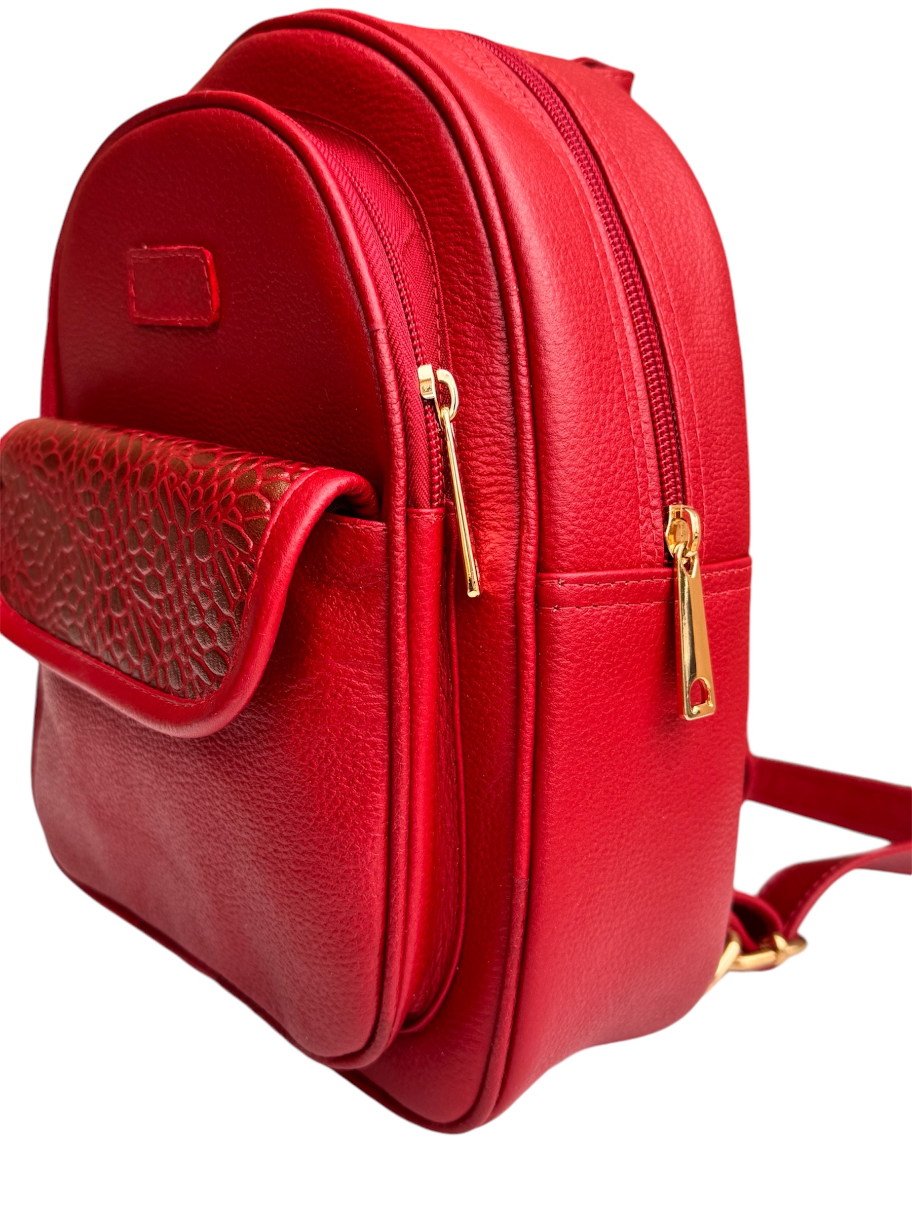 Bolso tipo morral mini en cuero. Medidas aproximadas 21 cm de ancho, 28 cm de alto y 11 cm de longitud.